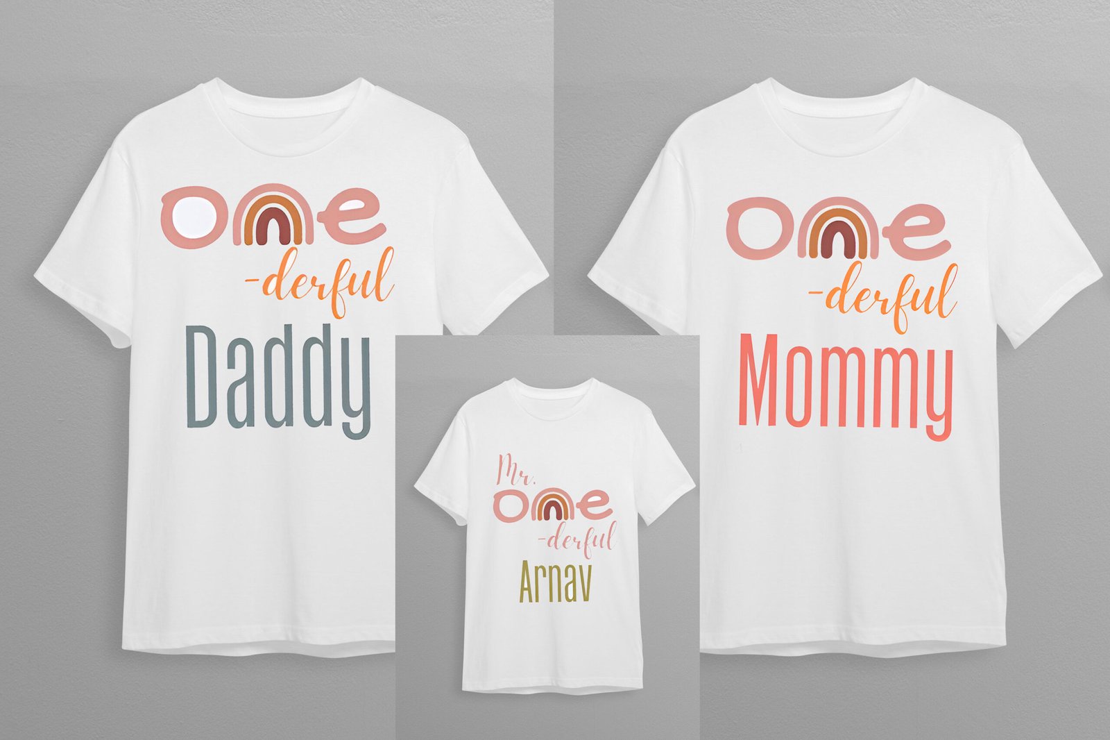 Celebrate your little one’s first birthday in style with our adorable “One-derful” family matching t-shirt set! Featuring custom tees for Daddy, Mommy, and Baby, each shirt is printed with playful pastel rainbow typography and personalized details. Perfect for birthday parties, photoshoots, or as a thoughtful gift for a milestone celebration. Crafted from soft, breathable cotton for all-day comfort and joy.
