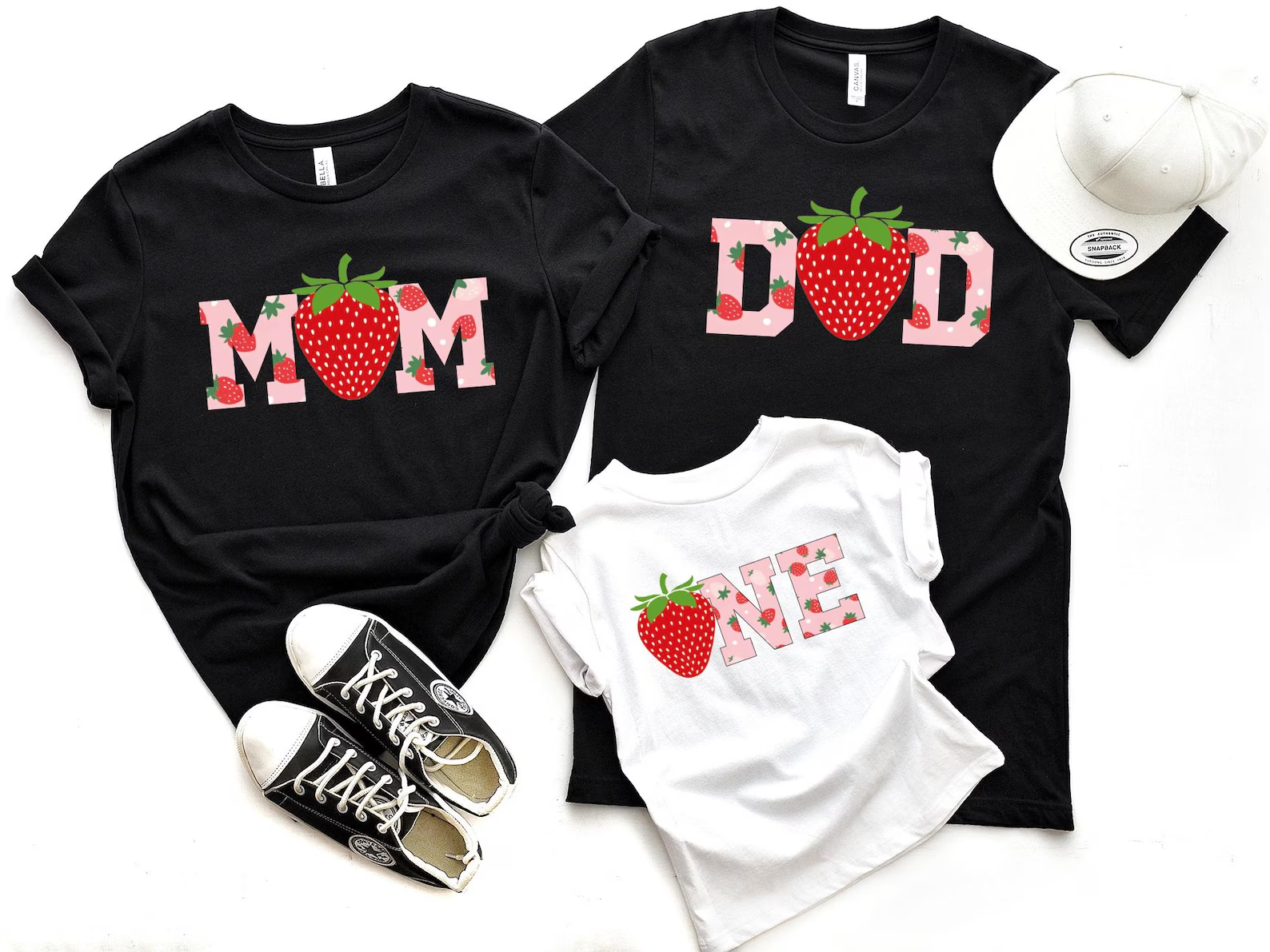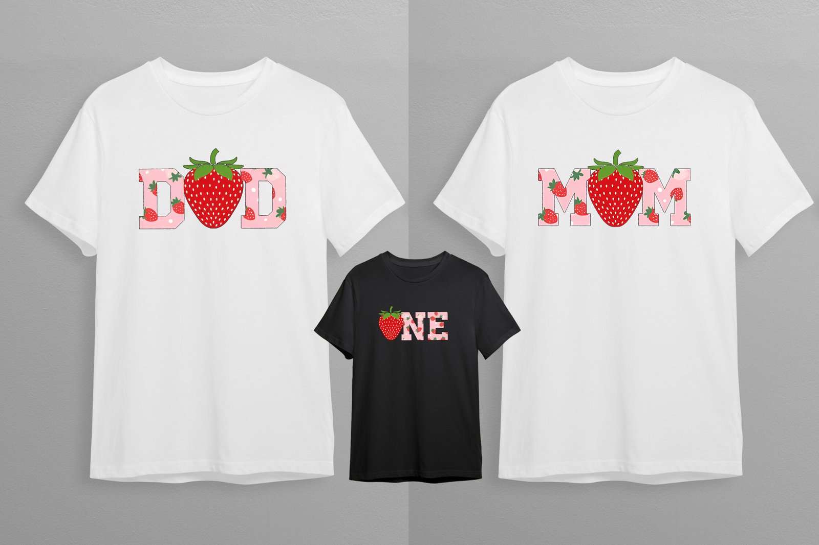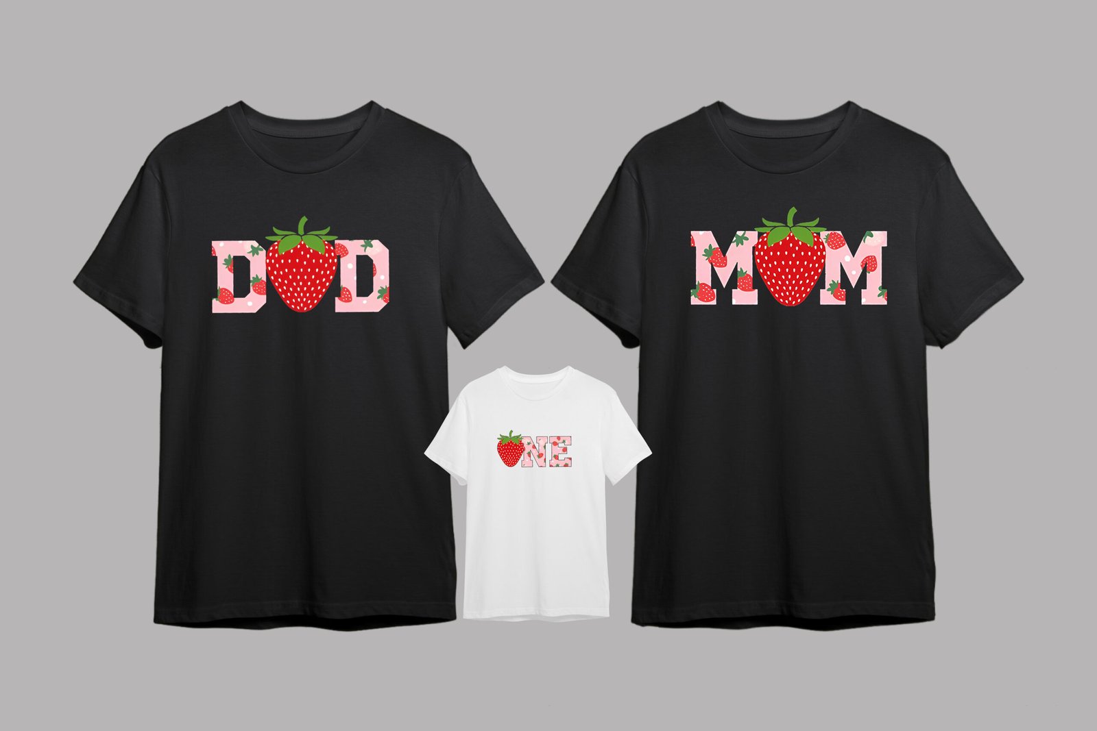 Celebrate your little one’s berry first birthday in style with this adorable strawberry-themed family matching t-shirt set! Featuring cute strawberry-filled “MOM”, “DAD”, and “ONE” text designs, this set is perfect for sweet birthday photos and party fun. Comfortable, stylish, and playful—ideal for the whole family!