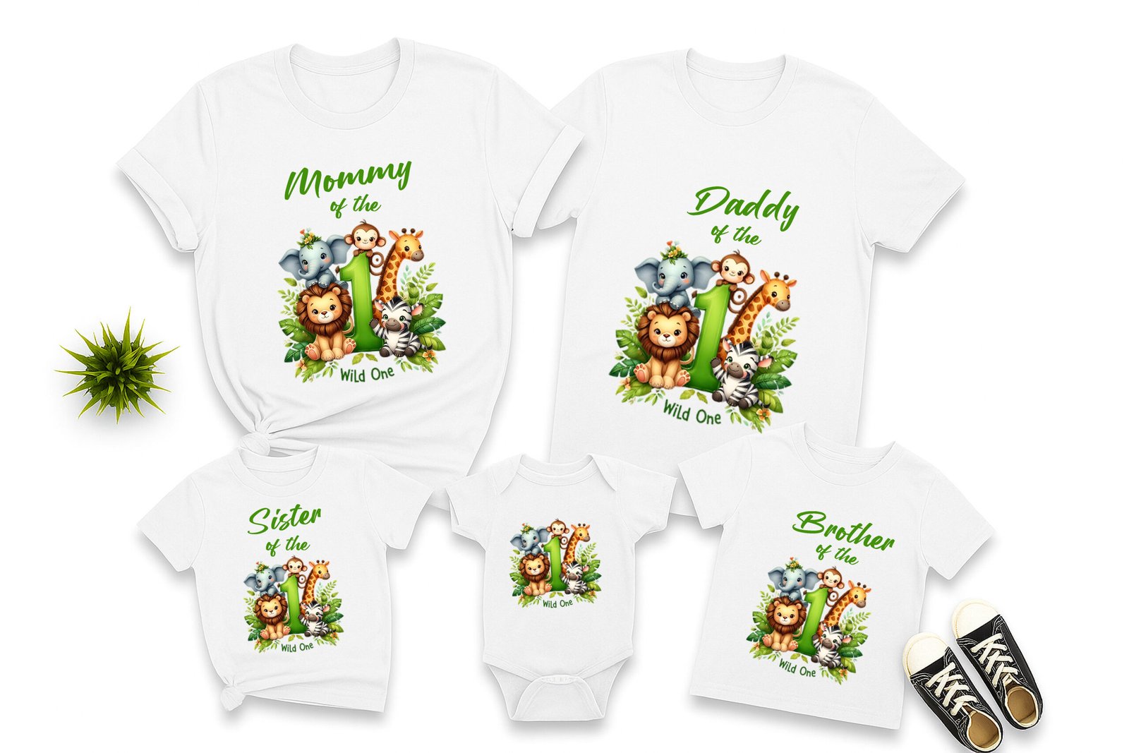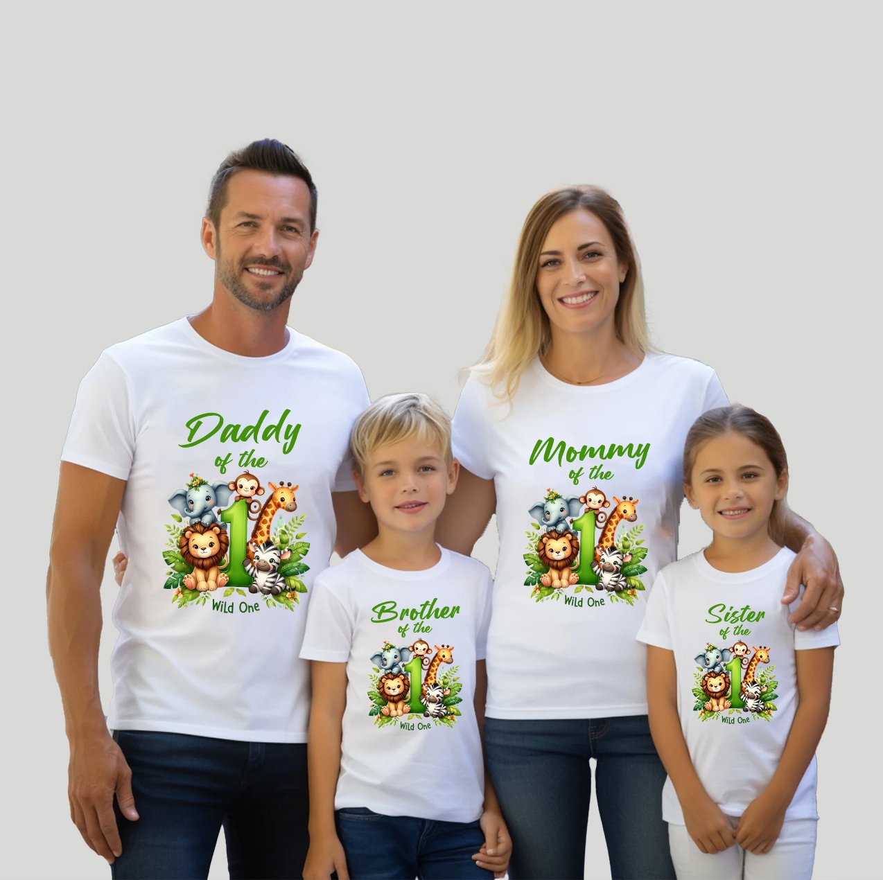 Celebrate your little one’s first birthday with our adorable “Wild One” jungle-themed family t-shirts. Featuring cute safari animals and vibrant designs, these matching shirts are perfect for family photos, parties, and creating lasting memories.